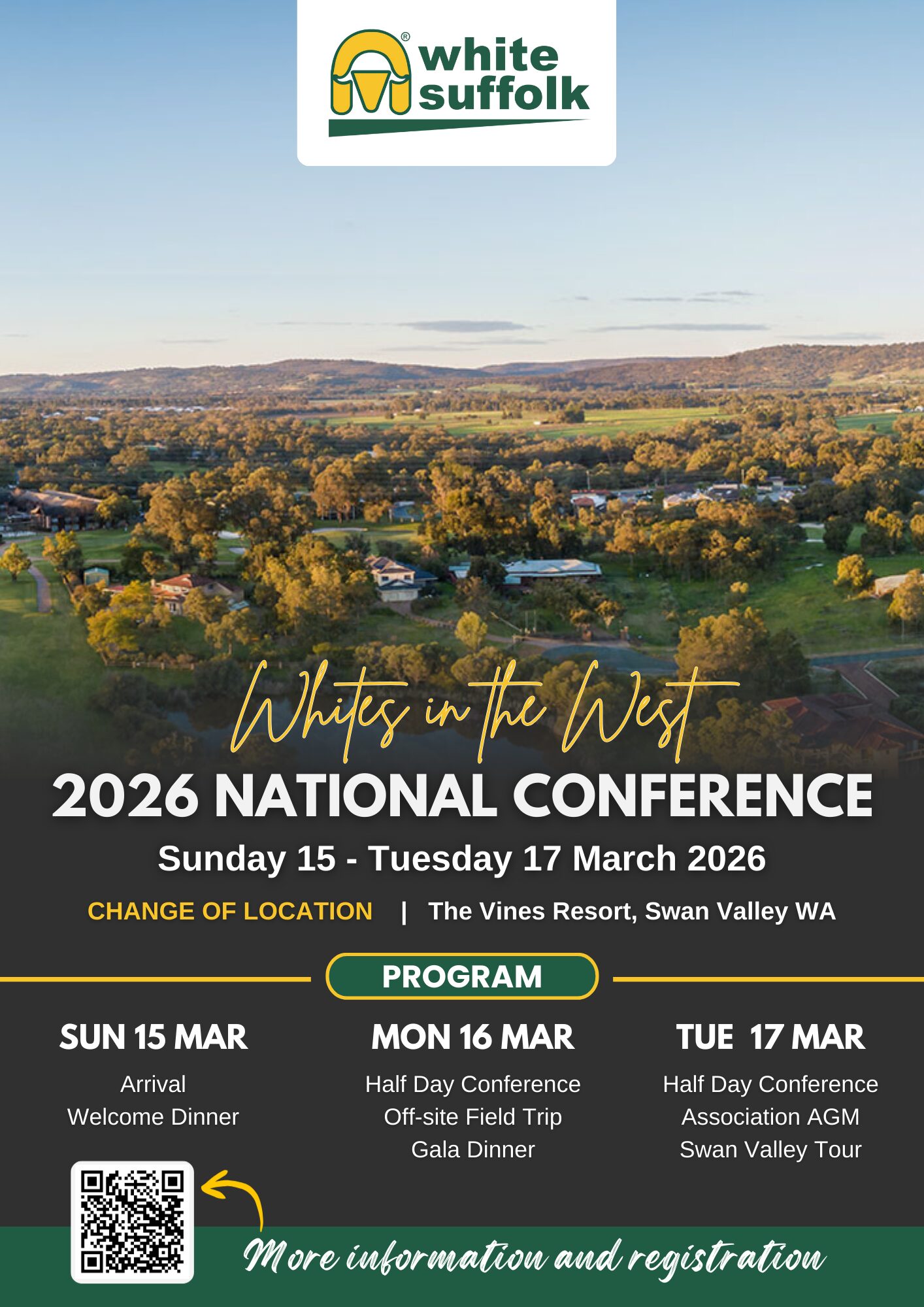 Join White Suffolk breeders and industry leaders from across the country for 3 days of networking, knowledge-sharing and insight into White Suffolk breeding and the current and future landscape of our sheep industry. The conference will feature informative speaker sessions, industry updates, networking opportunities and social events, all set against the backdrop of one of Western Australia's most renowned wine regions.